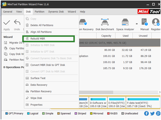 Step 1: Please boot PC from the bootable disc you have built. Then in the main interface of MiniTool Partition Wizard, select the target hard disk to click “Rebuild MBR” from “Check Disk” menu.