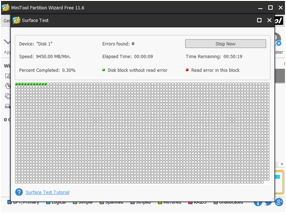 Step 3: Then click “Start Now” button to start a disk test. During the process, MiniTool Partition Wizard will mark bad sector “red“, and mark disk block without error “green“.